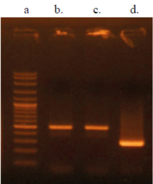 B. Amplificación de ADN: los fragmentos de ADN se amplificaron mediante el método de la reacción en cadena de la polimerasa (PCR). Las reacciones de amplificación se llevaron a cabo mediante un Ciclador Térmico Professional Basic (Biometra). Las amplificaciones para la detección del rs7216389 fueron en 25 µl de una solución que contenía: Tris-HCl (10 mM, pH=8,3), KCl (50 mM), MgCl2 (1,5 mM), los cebadores de cada reacción (10 µM), dNTPs (200 µM de cada uno), ADN extraído y 1 U de ADN polimerasa Go. Las condiciones de ciclado fueron una primera etapa a 94ºC durante 5 min de desnaturalización inicial, seguido de 35 ciclos de 35 s a 94ºC, 60 s a 60,6ºC y 60 s a 72ºC, con un etapa de extensión final a 72ºC por 5 min. Las amplificaciones para la detección del rs 2786098 fueron en 25 µl de una solución que contenía: Tris-HCl (10 mM, pH=8,3), KCl (50 mM), MgCl2 (3 mM), los cebadores de cada reacción (10 µM), dNTPs (200 µM de cada uno), ADN extraído y 1 U de ADN polimerasa Go. Las condiciones de ciclado fueron una primera etapa a 94ºC durante 5 min de desnaturalización inicial, seguido de 35 ciclos de 35 s a 94ºC, 60 s a 61,8ºC y 60 s a 72ºC, con un etapa de extensión final a 72ºC por 5 min. Con el propósito de constatar la correcta amplificación de los segmentos de ADN, los productos de PCR fueron visualizados en geles de agarosa al 1% teñidos con bromuro de etidio. En el gel se sembró 10 μl del ADN genómico extraído para cada muestra con 1,5 μl de buffer de corrida. También se sembró el marcador de tamaño molecular 1 Kb DNA ladder (Invitrogen lifetechnologies) a fin de estimar la concentración de ADN genómico total obtenido en la extracción. Todas las extracciones se conservaron en buffer TE a –20ºC. Los productos de PCR se purificaron mediante un kit de purificación de PCR (QIAquick, QIAGEN) para verificar la amplificación de la región correcta y confirmar la presencia de los polimorfismos descriptos en humanos mediante secuenciamiento directo.