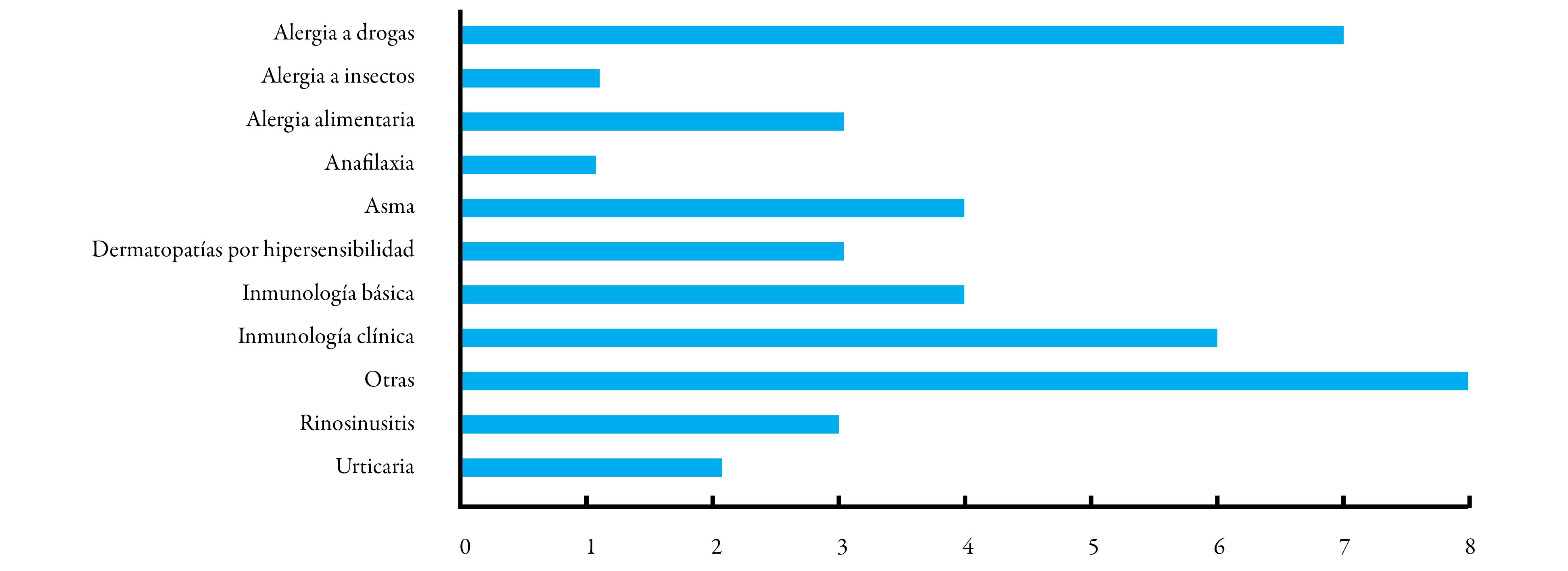 El Congreso brindó también la oportunidad de dar a conocer la producción científica de nuestros investigadores. Fue así que se presentaron varios trabajos de investigación para competir por los premios instaurados. También fueron aprobados 42 trabajos libres, presentados bajo la modalidad de póster electrónico, donde se advirtió la diversidad de temáticas abordadas (Figura 1) y el alto porcentaje de estudios abordando temas de inmunología, tanto clínica como básica.