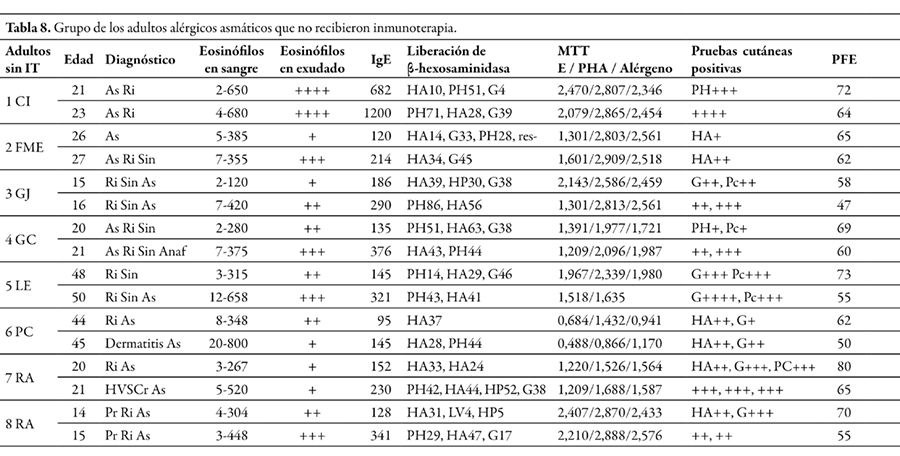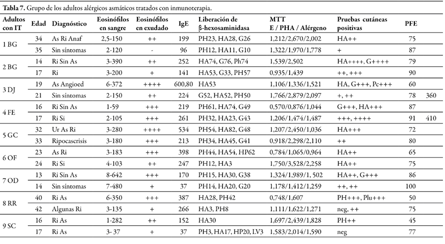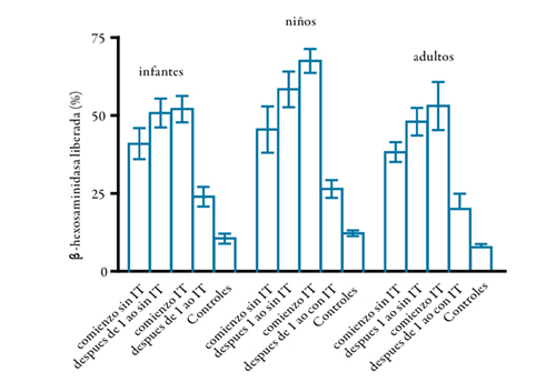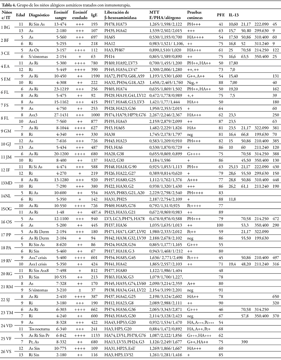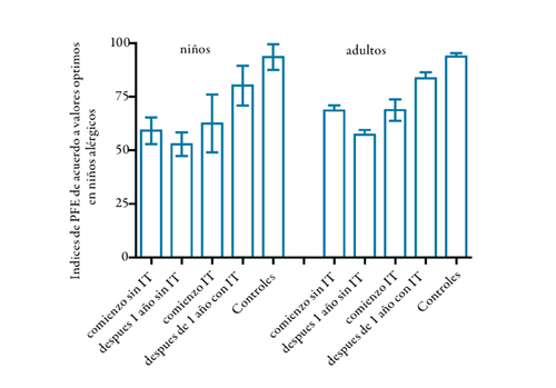 Resultados. Niños y adultos sin IT empeoraron sus reducidos valores de PEF. Niños y adultos después de IT mostraron incremento en los volúmenes de PEF (p<0,0001). Todos los grupos con IT redujeron la reactividad cutánea (p<0,0001, p<0,0001 y p<0,02) y la liberación de B-H de basófilos desafiados con el alérgeno específico (p<0,0001, p<0,0001 y p<0,003). Niños y adultos con IT observaron disminución en los niveles de IgE, ambos p<0,05, y redujeron los niveles de células eosinófilos nasales (p<0,0001 y p<0,01). Solamente los niños tratados con IT redujeron los niveles de células eosinófilas sanguíneas (p<0,0001). Las PBMC de infantes y niños con IT disminuyeron los índices de proliferación desafiadas con el alérgeno específico, ambos p<0,05. Los pacientes alérgicos observaron menores niveles de IFN-γ (p<0,02) y más altos niveles de IL-13 (p<0,05) y sCD23 (p<0,001) que los hallados en controles.