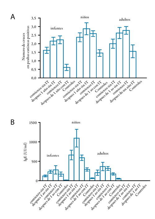 Al cabo de un año, los pacientes sin IT no modificaron la reactividad cutánea específica al alérgeno, mientras que los niños y adultos con IT redujeron significativamente la reactividad cutánea alérgeno (p<0,001 y p<0,05, respectivamente) (Figura 1 y Gráfico 2A).
