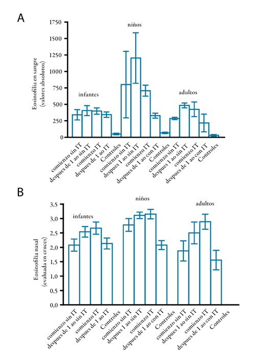 Niños y adultos tratados con IT redujeron significativamente los índices de eosinofilia en exudados nasales (p<0,0001 y p<0,01, respectivamente). Los infantes con o sin IT así como los niños y adultos sin IT no modificaron los valores del año anterior. Los promedios de los valores obtenidos fueron más altos que los observados en los controles (p<0,01) en los tres grupos (Gráfico 3A).
