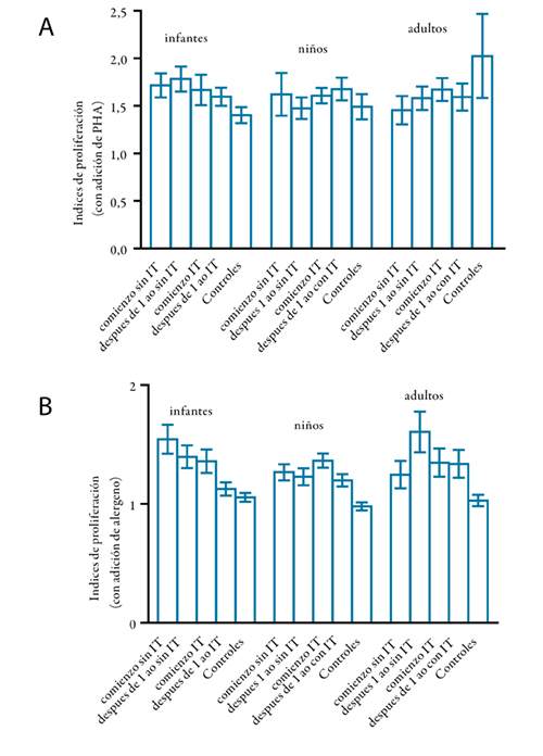 Los índices de proliferación con PHA al comienzo y después de un año de IT proliferaron como sin estímulo. Sin embargo, después de un año la expansión celular producida por el alérgeno específico fue similar a la de las células cultivadas sin estímulo.