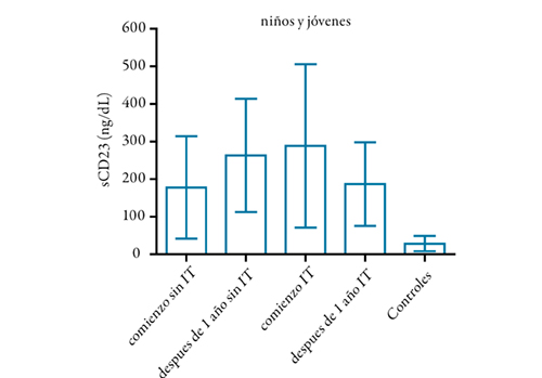 Los niños y jóvenes alérgicos mostraron mayores niveles de sCD23 en suero que los controles (p<0,001). Los valores de sCD23 no se modificaron en pacientes sin o con IT (Gráfico 7).
