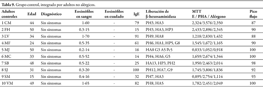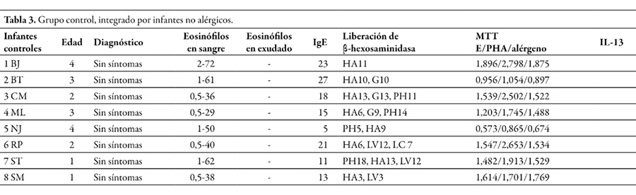 Metodología. Se incluyeron 81 pacientes alérgicos asmáticos: 28 infantes, 36 niños, 17 adultos y 27 controles. En los niños y jóvenes se evaluó el pico flujo espiratorio (PEF), reactividad cutánea, se registró eosinofilia sanguínea y de exudado de mucosa nasal, liberación de enzima β-hexosaminidase (β-H) de basófilos, proliferación de PBMC estimuladas con alérgeno específico o PHA; se cuantificaron las concentraciones de IgE, IL-13 y sCD23 en sueros y de IFN-γ en sobrenadantes de cultivos de PBMC.