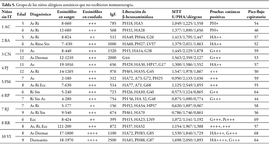 En niños, los principales parámetros indicadores de la evolución favorable de la enfermedad fueron: incremento del índice PFE, descensos de eosinófilos en sangre y mucosa nasal, reducidos niveles de IgE y escasa reactividad cutánea. En ellos, después de un año con IT, hubo incremento de la tolerancia por la disminución de la proliferación celular inducida por el alérgeno.